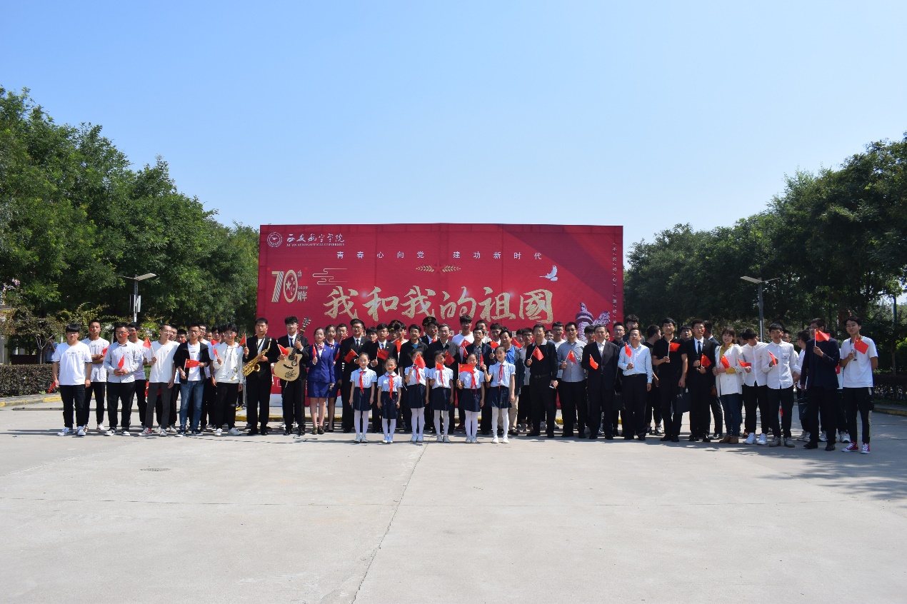 为庆祝新中国成立70周年,2019年9月25日午时,西安航空学院于阎良校区第一餐厅前十字路口处举办《我和我的祖国》快闪活动。此次活动由学校党委宣传部、学生工作部(处)、校团委、飞行器学院、航空心翼辅导员工作室联合主办,学校党委书记陈平社、校长曹庆年、学校党委副书记刘谦、副校长宋文学等学校领导出席此次活动。