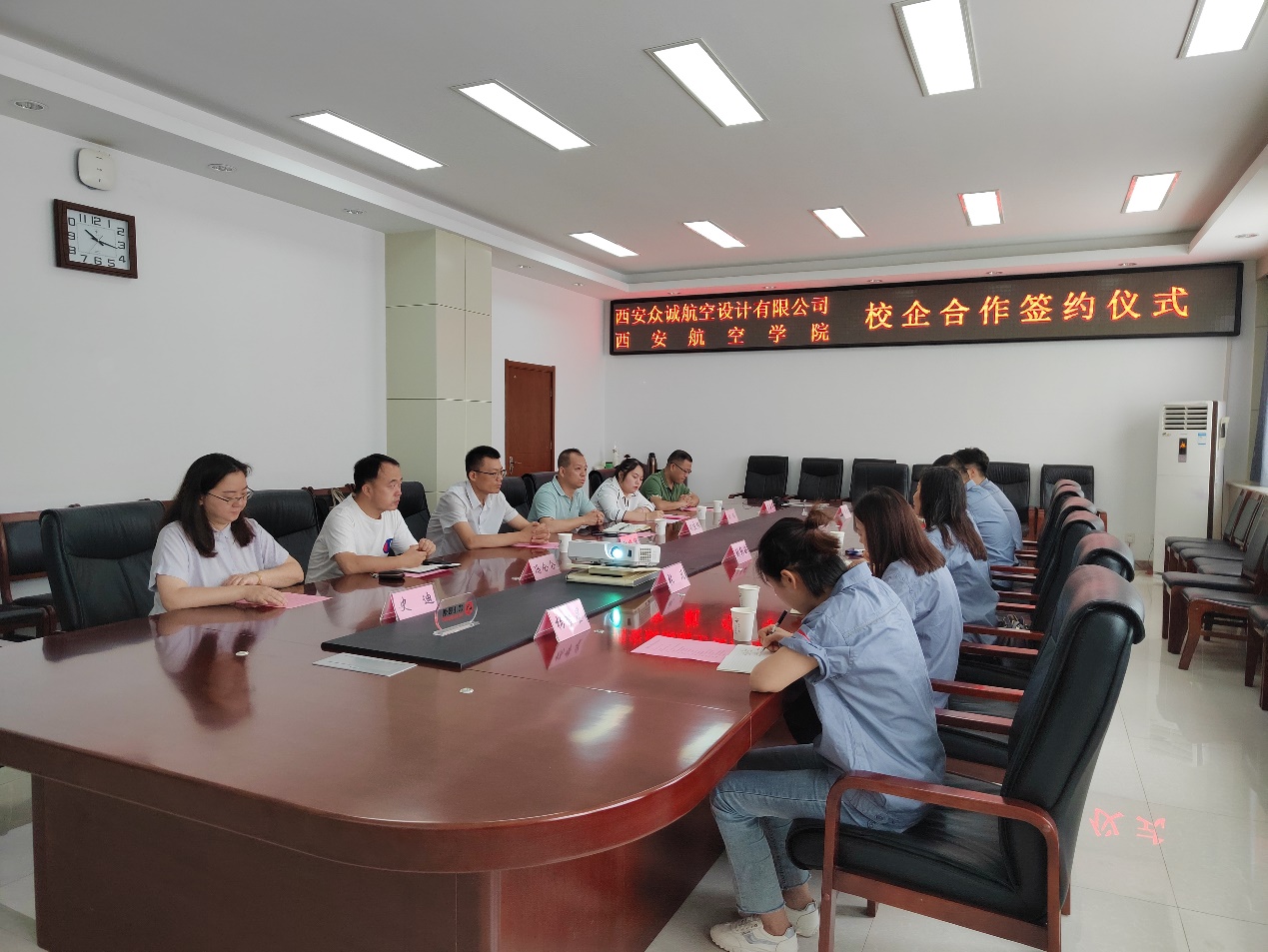 616日,飞行器学院与西安众诚航空设计有限公司校企合作协议签约仪式在阎良校区第一会议室举行。西安众诚航空设计有限公司技术副总经理刘转娥、综合副总经理孙婵娟、市场部部长张凡、生产部部长王军、设计部主任严殿鑫,飞行器学院党总支书记刘建强、院长助理张建华、综合办主任冯仑仑、飞行器设计教研室副主任刘璐、教工党支部书记谯盛军、2024届辅导员史迪出席仪式。仪式由刘璐主持。